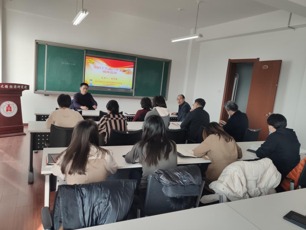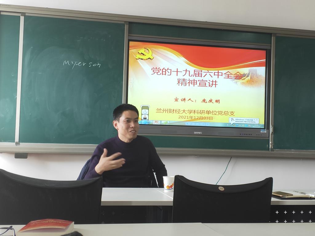 12月3日下午,高教评估中心党支部全体党员参加了科研单位党总支召开的党的十九届六中全会精神专题宣讲会,宣讲会在丝绸之路经济研究院会议室举行,学校讲师团成员、马克思主义学院庞庆明教授为全体党员作了专题辅导解读。宣讲会由科研单位党总支书记任重主持,科研单位党总支其它两个支部的全体党员也参加了此次会议。